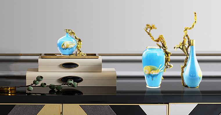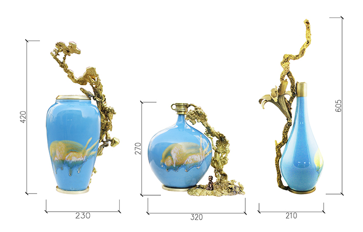 首先給彩瓷加了一個(gè)銅底座、銅沿口,然后把熔化后的銅水倒進(jìn)沙里,形成不同自然形狀后再與彩瓷底座和沿口相連,效果出人意料的好,厚重與輕脆相融,古樸與現(xiàn)代結(jié)合,也不知是瓷攀上了銅,還是銅纏上了瓷。相得益彰,妙不可言。